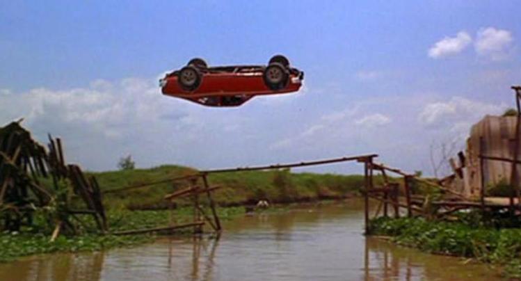 Dá um ré forte no Hornet, engata a marcha à frente e pisa fundo. O salto em espiral foi perfeito. Tudo foi calculado por computador para que a cena fosse perfeita. Estes foram feitos na Universidade de Cornell da Califórnia. O dublê (Loren Willert) estava num acento entre os bancos da frente. Nestes estavam bonecos. O carro foi alongado em um centímetro, tinha peso de 1.430 quilos e percorreu 15, 86 metros a uma velocidade de 64.36 km/h. O AMC Hornet ficou imortalizado nesta cena. Veja o salto