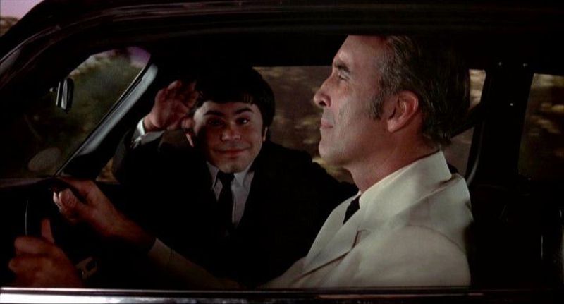 Acima Scaramanga, o Homem da Pistola de Ouro e seu assistente Nick Nack (Hervé Villechaize). Trata-se de uma maquete, mas a cena é muito bem feita.