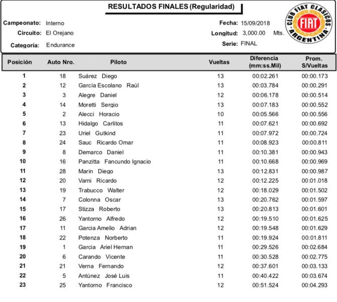 Após uma breve espera para discutir as vicissitudes da prova, os prêmios das competições foram entregues, liderados pelos presidentes dos dois clubes, Esteban Ibarra pelo CFC e Juan Ignacio Mártire pelo CAR e pelas autoridades da corrida. Voltamos para as casas com a satisfação de uma jornada intensa mas agradável entre amigos, admiradores e a certeza de que unindo vontades e esforços, é possível organizar eventos de qualidade com alta satisfação de todos os participantes. Nós convidamos você a ver os resultados dos testes nos formulários em anexo!