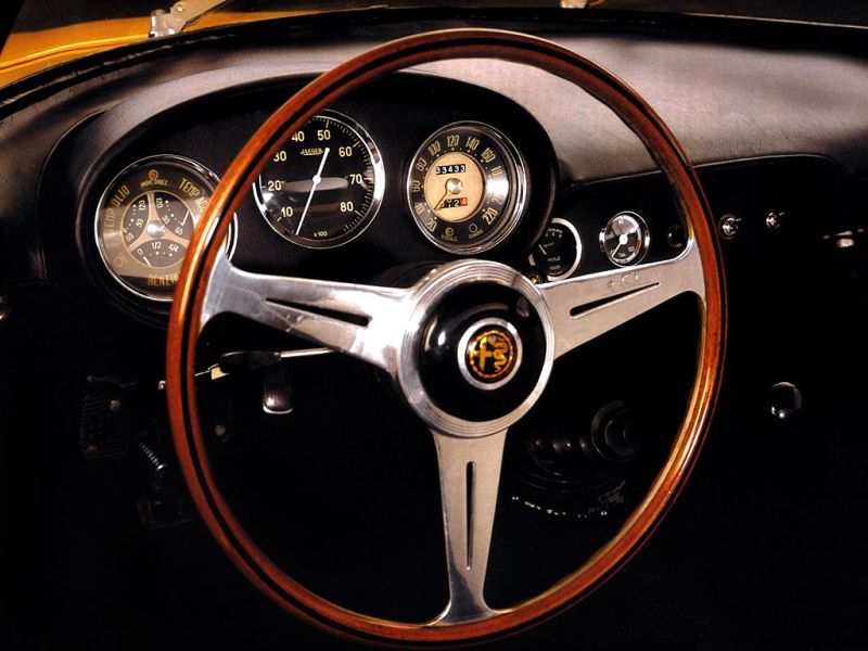 Interessante também e pronta para as competições era a versão "Alleggerita", ou seja, mais leve, por conta de capô, portas de passageiros e tampa do porta malas eram em alumínio. Atrás e nas laterais ao invés de vidros, tinham plexiglas. Ficavam mais leves. Abaixo o painel completo com volante com aro de madeira que era opcional.O original era de baquelite . Tinha marcador de temperatura do óleo, temperatura do motor e marcado de nível de combustível. No caso do modelo mais leve, o tanque tinha capacidade para 80 litros. Para o modelo normal 53 litros. No centro conta-giros graduado a 8.000 rpm e a direita velocímetro até 220 km/h como todo bom Alfa Romeo.