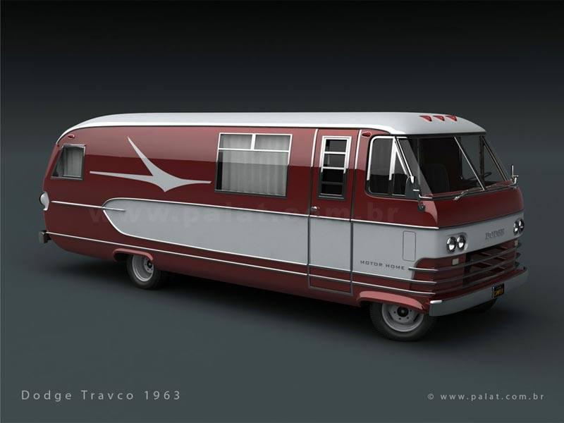 Dodge Travco 1963. Foi uma motor Home com desenho aerodinâmico. A empresa Travco foi um construtor de veículos de lazer que começou na década de 60 e foi até 1980. Este tipo de veículo é muito popular nos Estados Unidos.