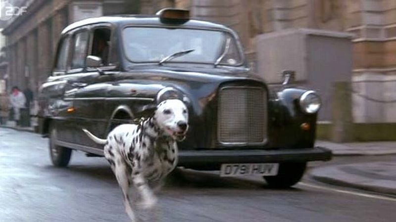 O filme 101 Dálmatas (101 Dalmatians) feito em parceira por estúdios do Reino Unido dos Estados Unidos foi lançado em 1996 e contou com atores famosos como Glenn Close, Jeff Daniels, Joely Richardson, Joan Plowright e Hugh Laurie. Esta aventura sobre cães baseada no desenho homônimo de 1961 conta a história do americano, designer em computação, Roger Dearly (Jeff Daniels) que vive com seu cão dálmata, Pongo, na bela capital inglesa de Londres. Nesta, certo dia, num passeio Roger está com Pongo que fareja a fêmea Brenda e se encanta. Após este momento romântico uma confusão enorme começa nas ruas da cidade. Acaba por conhecer a dona de Brenda, a estilista Anita Campbell-Green (Joely Richardson). Eles também se apaixonam, casam-se e na mesma casa, meses depois nascem 15 filhotes dálmatas. Abaixo Pongo "ultrapassando" um Táxi Londrino modelo FX. Saiba mais.