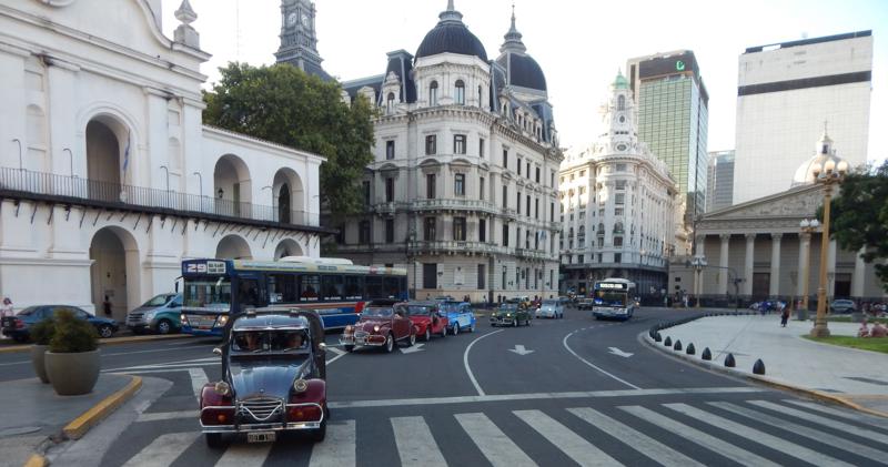 Alguns minutos depois, o 3cv M28 de Javier Jauregui iniciou a caravana, percorrendo a Av. Dorrego, atravessando grande parte da mítica Av. Corrientes. Até chegar ao Obelisco de Buenos Aires e virar uma de suas diagonais em direção à Plaza de Mayo sede do Governo Argentino. Ao seu redor, o percurso era voltado para o bairro mais novo da cidade: Puerto Madero. Depois de se virar e fazer algumas paradas para fotos, a caravana seguiu em direção à escultura monumental de Las Nereidas, localizada na margem sul.