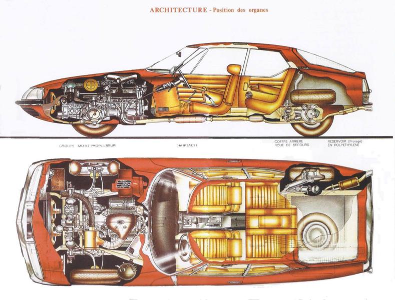Seguindo a tradição francesa da marca tinha tração dianteira. Acelerava de 0 a 100 km/h em 8,3 segundos e alcançava 225 km/h e cobria o primeiro quilômetro em 29,5 segundos. Era o automóvel com tração dianteira produzido em série mais veloz do mundo. O cambio manual contava com cinco velocidades. Sua taxa de compressão era de 9,0:1 e era alimentado por três carburadores de corpo duplo da marca Weber. Seu torque máximo era de 24,1 mkg a 4.000 rpm. Este propulsor também seria montado no Maserati Merak, no Quattroporte II e no Ligier JS2.