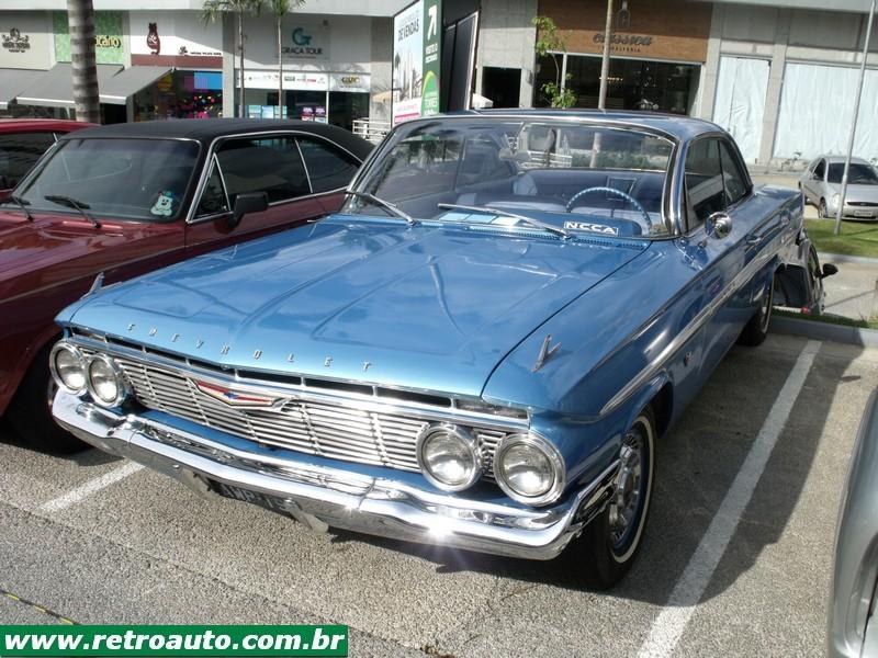 Impecável Chevrolet Impala cupê SS 1961 (Super Sport). Havia ainda a carroceria quatro portas com ou sem coluna, duas portas com coluna, conversível e perua. O mais potente cobria o 1/4 de milha em 14,7 segundos atingindo 155 km/h! Tinha 410 cavalos e 6.702 cm³ em seu V8.