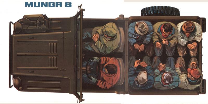 Interessante também era a versão Munga 8. Como o próprio nome indica a capacidade total era de oito passageiros. Os de trás iam com os ombros colados! Neste o comprimento total da carroceria passava a ser de 3,6 metros e o peso total era de 1.120 quilos.