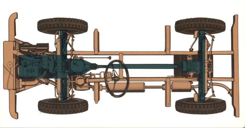 A tração era dianteira e o cambio tinha quatro marchas sendo que a primeira não era sincronizada. Havia também a opção de tração nas quatro rodas possuindo dois diferenciais. O chassi era formado por longarinas paralelas sendo que os pára-choques faziam parte. Para melhor sustento da carroceria ainda haviam mais quatro barras perpendiculares para apóia-la. Era muito forte e bem construído.