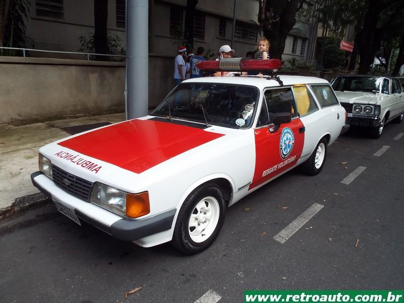 Uma ambulância que não é mais usada para socorros e deu um colorido natalino ao evento Conheça a família Chevrolet Opala
