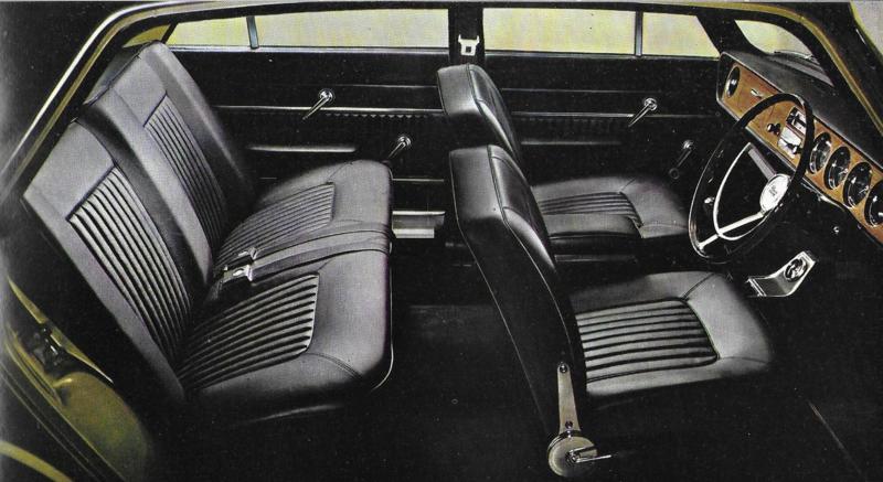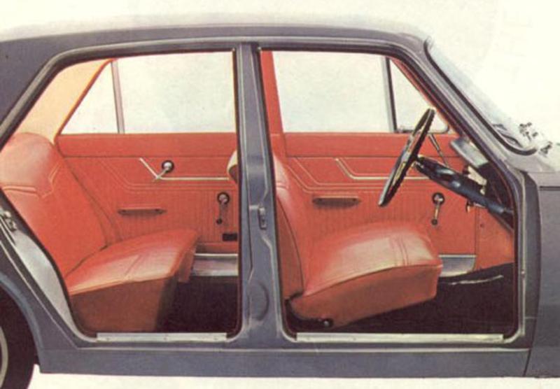 Por dentro era simples, porém com acabamento correto. Comportava cinco adultos, pois era espaçoso e o banco dianteiro era inteiriço. O volante tinha dois raios e mais um aro oblongo cromado para acesso a buzina. O painel com desenho horizontal abrigava velocímetro, nível do tanque e temperatura da água. O destaque nas publicidades era para a segurança alertando que as portas de trás tinham travas para impedir que crianças abrissem e a falta de metal em forros de portas e contornos de bancos.