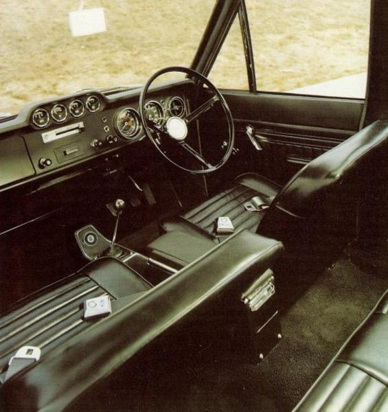 Por dentro o volante esportivo e a alavanca do cambio de quatro marchas tinham acabamento em madeira. O painel com fundo metálico escovado era muito bem equipado. Ao centro, o velocímetro e o conta-giros. Depois vinham o marcador de temperatura da água, óleo, manômetro, nível do tanque de gasolina e amperímetro.
