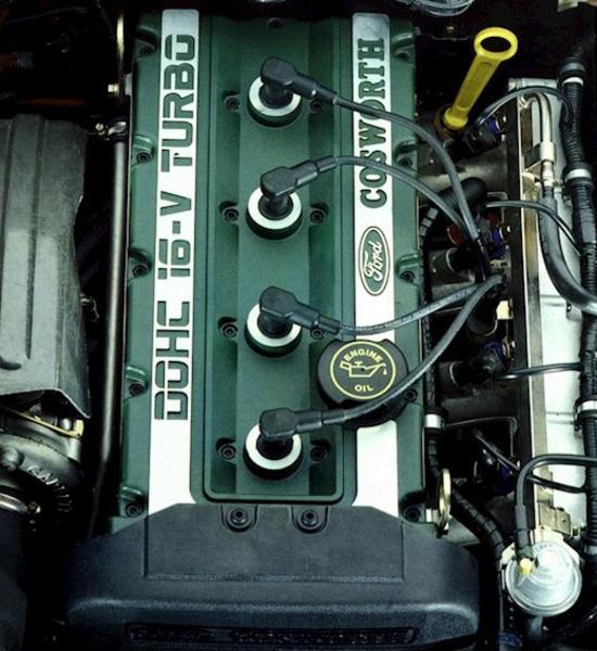 Também foi apresentada a versão mais famosa e desejada: - a Cosworth (acima) . Este nome é cultuado na Inglaterra há anos e é sinônimo de velocidade, aceleração e emoção. O motor instalado na versão Hatch de cinco portas, também chamada pelos britânicos de Saloon, tinha quatro cilindros em linha, 1.994 cm³, quatro válvulas para cada, dois comandos, injeção eletrônica e turbocompressor Garret T3. A caixa tinha cinco marchas com relações curtas. Sua direção era hidráulica. Desenvolvia 204 cavalos a 6.000 rpm. Só podia ser abastecido com a gasolina Eurosuper. Seus quatro freios eram a disco sendo que os dianteiros eram ventilados. Os pneus de aro 15 tinham medidas 205/50 VR.