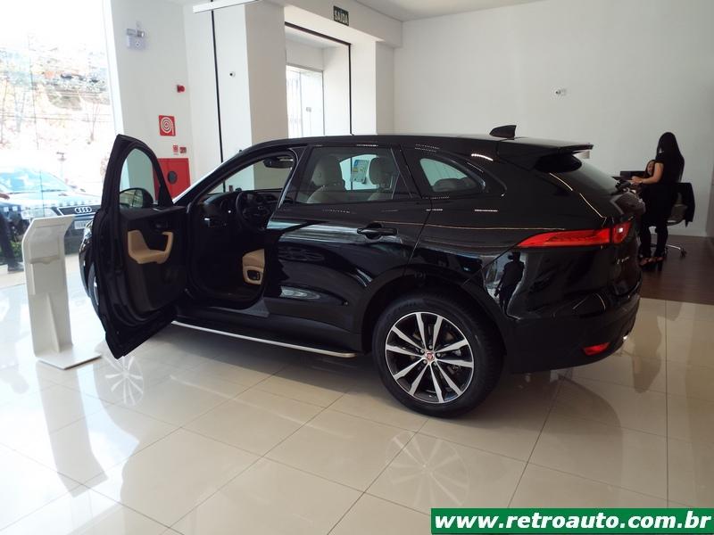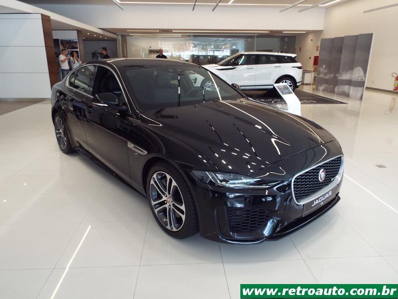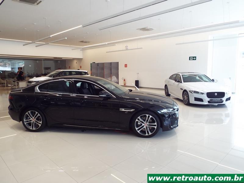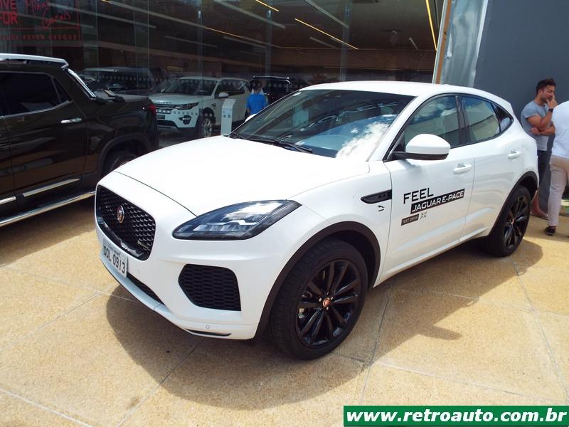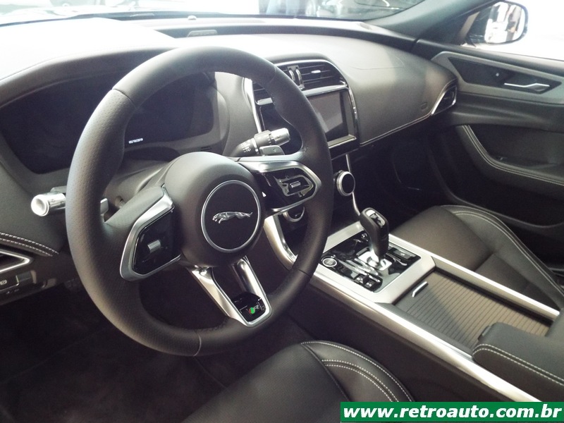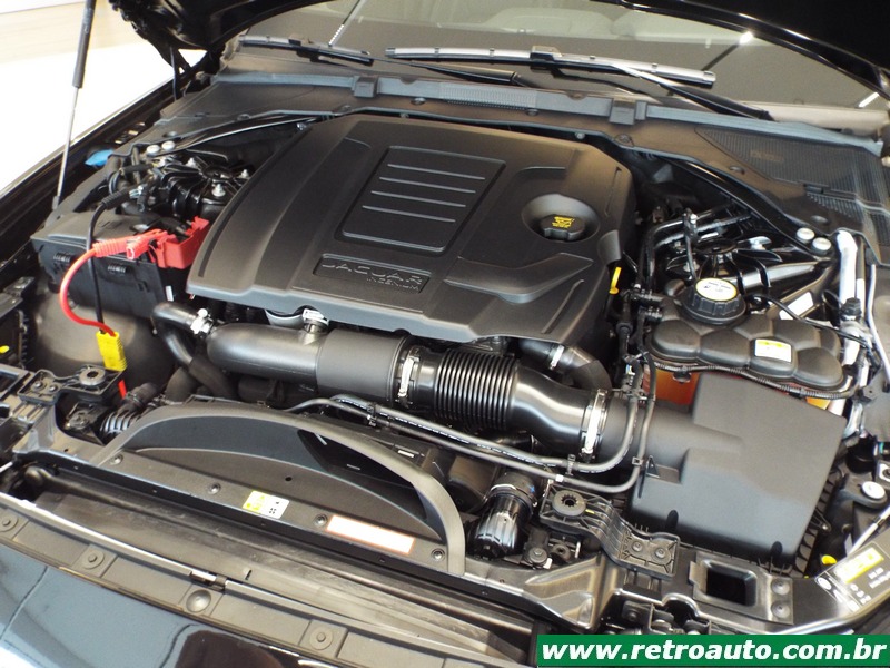 O modelo 2019/2020 é destaque no confortável salão da loja apresentado na cor preto Santorini. Seu motor dianteiro tem quatro cilindros em linha, 16 válvulas com comando no cabeçote, e está em posição longitudinal. O propulsor tem 1.997 cm³ e potência de 250 cavalos à 5.500 rpm. Movido a gasolina, tem torque de 36,6 mkgf a 1.200 rpm. É alimentado por um turbo compressor, tem tração traseira, faz de 0 a 100 km/h em 5,5 segundos e sua velocidade final é de 250 km/h. Seu cambio automático de oito marchas (seletor Jaguar SportShif) pode ser comandado por um alavanca no assoalho ou aletas no volante de ótima pega. Por fora, além da grade agressiva, tem faróis de LED (diodo emissor de luz, sigla em inglês de light-emitting diode) com um belo designer e prioriza a dirigibilidade principalmente a noite.