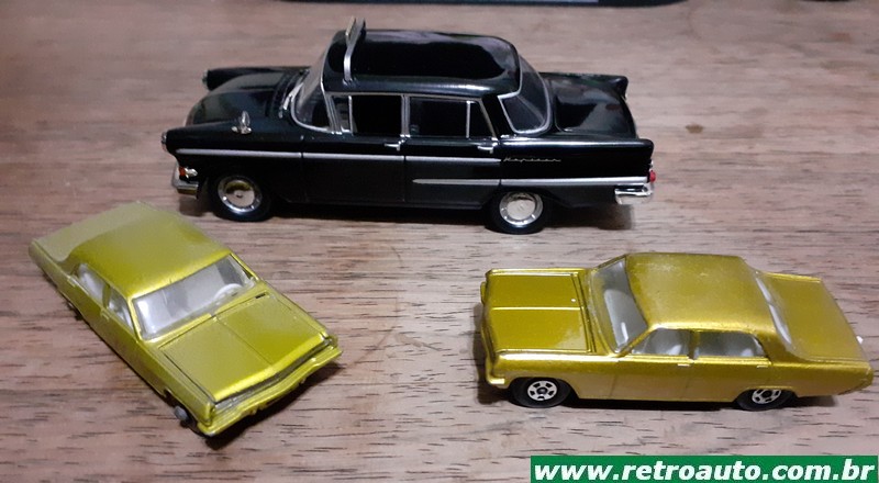 O preto é um Opel Kapitän da coleção Táxis do Mundo, Berlim 1959, na escala 1/43. Os outros dois Matchbox são Diplomat das décadas de 60 e 70. Abrem o capô e mostram o motor V8 detalhado