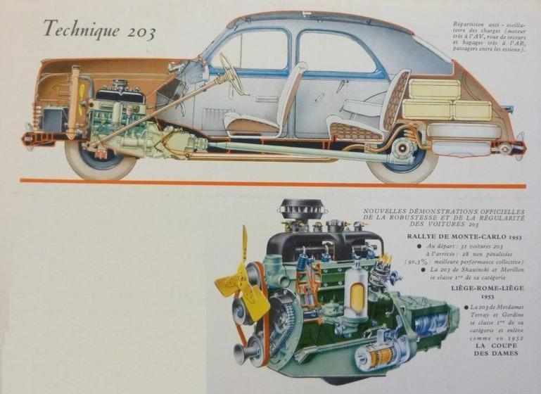 Em 1948, no Salão de Paris, era apresentado o modelo 203. Tratava-se de um modelo quatro portas, que levaria quatro passageiros com conforto. Suas linhas tinham clara inspiração americana.