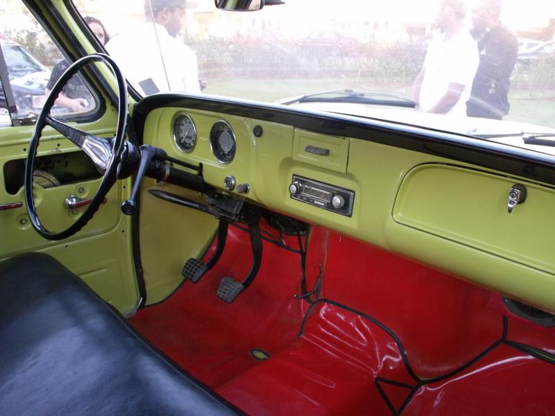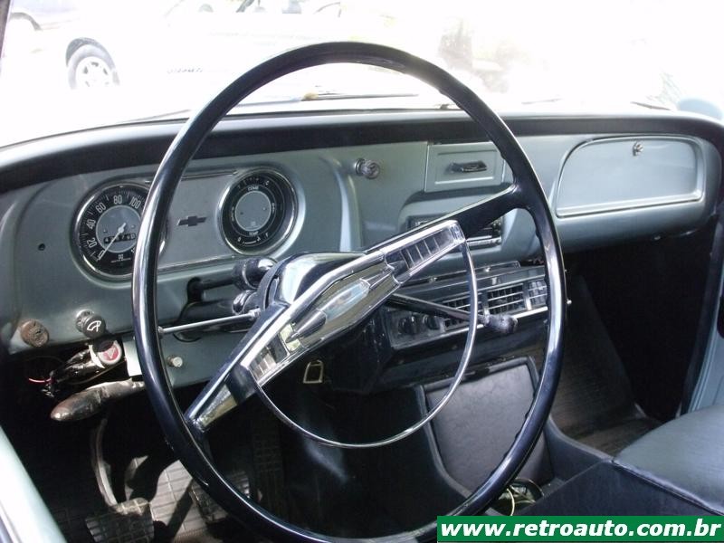 Por dentro da C-10. Volante de grande diâmetro, alavanca na coluna com três marchas, painel simples com velocímetro, marcador de temperatura da água, nível do tanque de combustível de 70 litros e luzes espia. Levava bem três passageiros na frente. No início da década de 70, tinha apenas dois faróis circulares na frente e para-choques na cor branca na versão básica.