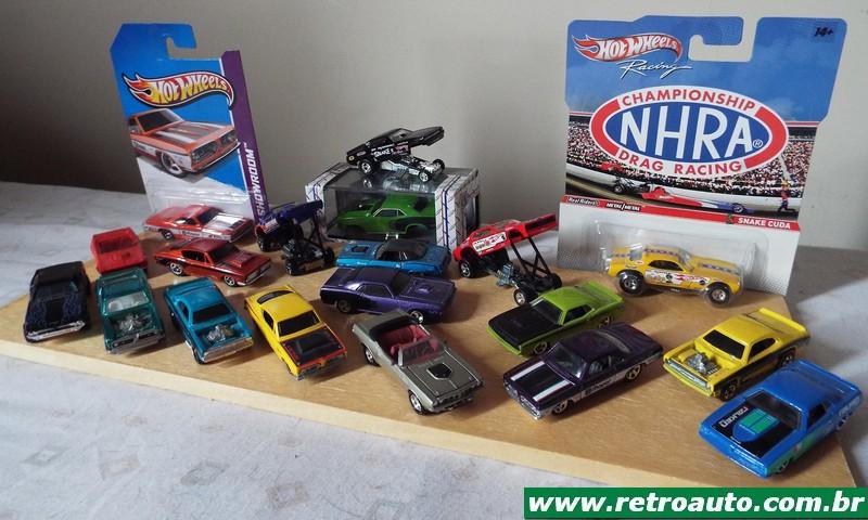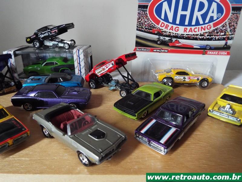Todos já foram comercializados e alguns ainda se acham. Acima Plymouth Hemi Cuda Roxo Maisto, Plymouth Hemi Cuda 1968 Amarelo capô preto HotWheels , Plymouth Hemi Cuda 1968 Ocre c/ faixas pretas HotWheels , Plymouth Hemi Cuda 1971 Bege metálico interior vermelho Johnny Lightning, Plymouth Hemi Cuda 1971 Laranja Maisto, Plymouth king Cuda 1967 Verde HotWheels Mattel, Plymouth Barracuda 1968 Sox&Martin Super Stock Amarelo capô preto HotWheels Mattel, Plymouth Barracuda 1970 azul Capota Preta HotWheels, Plymouth Barracuda Conversível 1970 Vermelho HotWheels , Plymouth Cuda 1972 Black Snake PrudHomme's Preto HotWheels, Plymouth Cuda AAR 70 Chumbo capô preto HotWheels, Plymouth Cuda AAR 70 Verde Capota preta HotWheels. Todos na escala 1/64