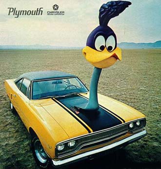 No começo dos anos 60, o modelo PlymouthValiant, derivado do Lancer da Dodge, também se destacava por ser mais simples e mais barato que este. Era um carro compacto para os padrões norte americanos. Com a escalada dos “Muscle Cars” nos EUA na década de 60, a Plymouth, interessada num segmento que crescia muito, tinha planos de adaptar um modelo seu que preenchesse os requisitos. Foi assim que, em 1968, baseado na carroceria dos irmãos Belvedere e Satellite, nasce o cupê esportivo RoadRunner. O nome teve inspiração na série de desenhos animados em que o pássaro Beep-beep, o papa-léguas, era perseguido pelo coiote. De aparência agressiva, o carrão media 5,15 metros e pesava 1.600 quilos. Tinha porte. Na frente quatro faróis e grade cromada com pequenos retângulos com fundo preto. Sobre o capô duas entradas de ar laterais para ajudar a refrigerar o motorzão e mostrar agressividade.