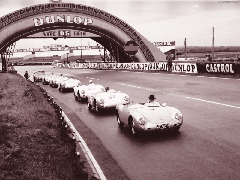 Vários Spyders da equipe da Porsche passavam pela famosa reta Hunaudières nas 24 Horas de Le Mans, prova em que o pequeno roadster acumulou oito vitórias.