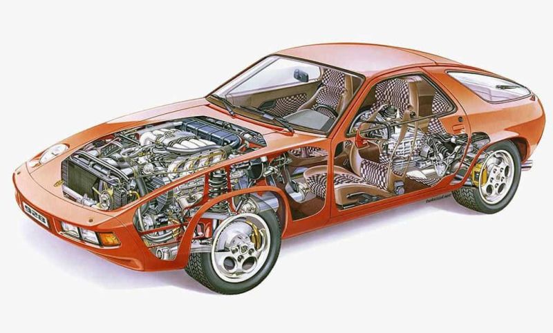 O primeiro modelo com motor dianteiro refrigerado a água da empresa que tem mais tradição em carros esportivos na Alemanha foi o pequeno 924. Era um quatro-cilindros cuja arquitetura serviu de base para o 928. O novo carro, porém, estava equipado com um moderno V8 de 4,5 litros (4.957 cm³) -- 0,5 litro menos que o projeto inicial, para reduzir o consumo -- com bloco e cabeçote em alumínio. A alimentação era feita por injeção Bosch K-Jetronic e fornecia 240 cavalos a 5.500 rpm. O cliente poderia optar por um câmbio manual de cinco marchas ou uma caixa automática de três.