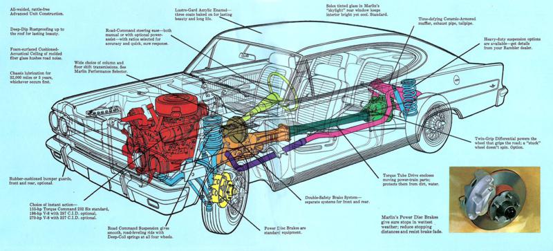Mais interessantes eram os de oito cilindros em “V”. O mais modesto começava com 201 cavalos e 4.704 cm³. Após vinha outro com 5.360 cm³ e 253 cavalos. Era alimentado por um carburador duplo Holley em posição invertida. O torque máximo era de 46,9 kgm. A caixa automática Flash-O-Matic, com conversor hidráulico tinha três velocidades. Chegava a 185 km/h. Esta velocidade final já o colocava com disposição para enfrentar a concorrência. O motor topo de linha descarregava 274 cavalos a 4.700 rpm. Sua relação peso potência era de 5,7 cavalos por quilo. Era alimentado por um carburador de corpo quádruplo também da marca Holley e chegava a final de 195 km/h fazendo de 0 a 100 km/h em 9 segundos. Bons números para o esportivo da AMC. Todos os modelos tinham tração traseira.