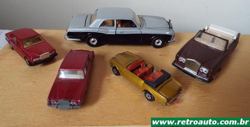 A Matchbox inglesa fez os dois modelos nos anos 60 e 70 o modelo Silver shadow vinha na cor bordô e o Corniche dourado com bancos marrom. Muito bonitos e mediam 75 milímetros e a tonalidade da pintura seguia os padrões do carro em escala original. Ficaram no catálogo durante anos. Depois veio o Silver Spirit em 1986, na imagem à esquerda. No alto, o prata e preto é um Corniche cupê da Corgi inglesa na escala 1/32. Abre portas, capô e porta-malas. O conversível marrom é da Solido francesa na escala 1/43.