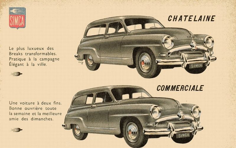 Como já era feito nos Estados Unidos, a Simca resolveu diversificar o número de carrocerias propostas. Chegavam ao mercado três versões de carroceria perua. Uma completamente fechada denominada Messagère (mensageira) e outra só com os vidros traseiros fechados chamada Comercial. A destinada à família, com ótima visibilidade, denominava-se Chatelaine e poderia vir em duas cores. Todas as versões perua tinham duas portas. Bem resolvida era a versão cupê sem coluna central. Agradou em cheio.