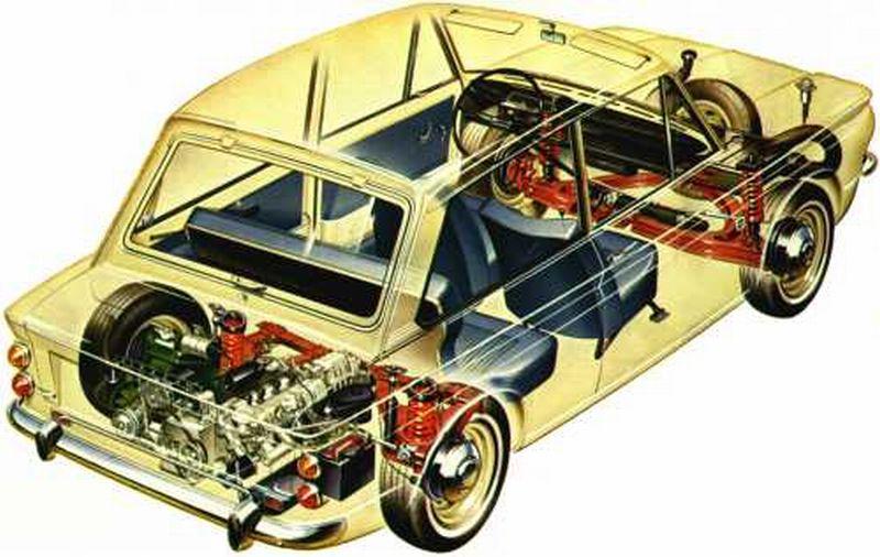 O bloco motor de liga leve, em posição traseira, tinha quatro cilindros em linha, 875 cm³ e desenvolvia a potência de 39 cavalos a 4.800 rpm. Era refrigerado a água. Sua taxa de compressão era de 10:1 e era alimentado por um carburador de corpo simples da marca Solex em posição invertida. As válvulas e o comando ficavam no cabeçote. Sua tração era traseira e o cambio tinha quatro marchas sincronizadas. Levavam o carrinho de duas portas, quase um três volumes, com ótima área envidraçada graças ao teto alto, que pesava 698 quilos, a honrosos 130 km/h.