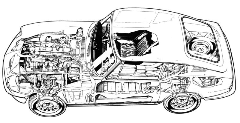 O capô fazia conjunto com os para-lamas formando uma só peça. Tinha abertura contra o vento. Atrás, ao contrário de outros GT’s concorrentes, tinha abertura do vidro traseiro que servia para a introdução de pequenas bagagens e acesso ao pneu sobressalente. Em curva e alinhada com o resto da carroceria, a traseira ainda abrigava o bocal do tanque, pequenos faroletes e luzes de ré.